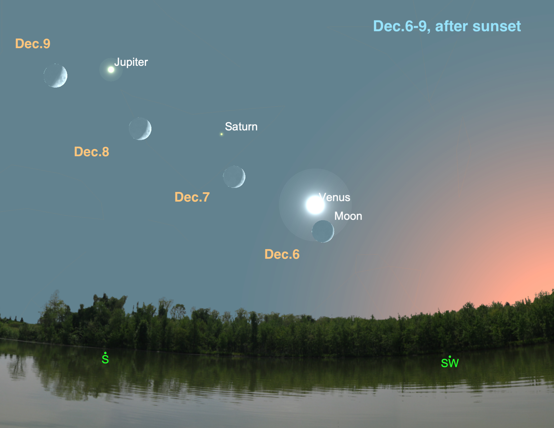 Over the course of just three days, from December 6 to 9, look towards the southwestern sky after sunset for the beautiful sight of the slim crescent Moon pairing up with three neighbouring planets. On December 6 it will will first have a close encounter with Venus. Then on December 7 it will appear near Saturn, and finally on December 8/9 it will join Jupiter. On each evening,  cosmic pairings will appear only a few degrees apart, creating a wonderful view for the unaided eye and of course through  binoculars too. But don’t wait too long to look. They will set quickly.