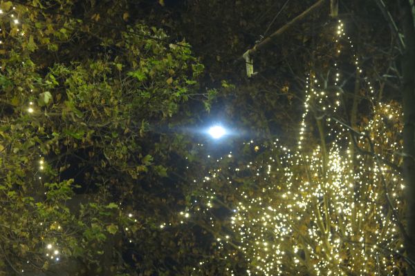 the Moon among the illuminated trees