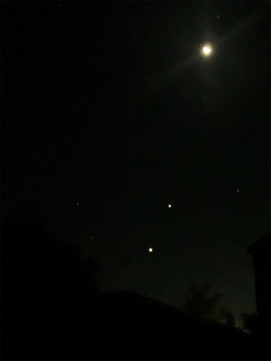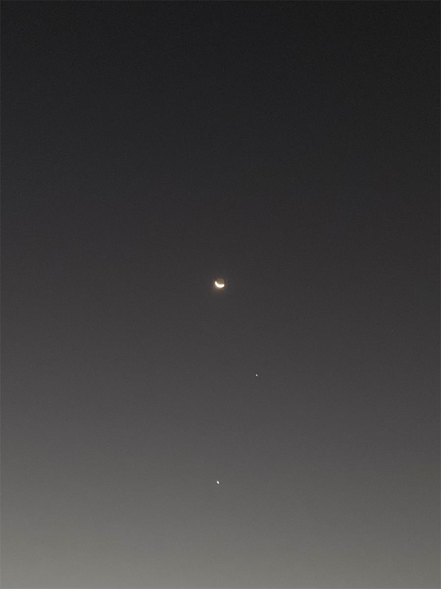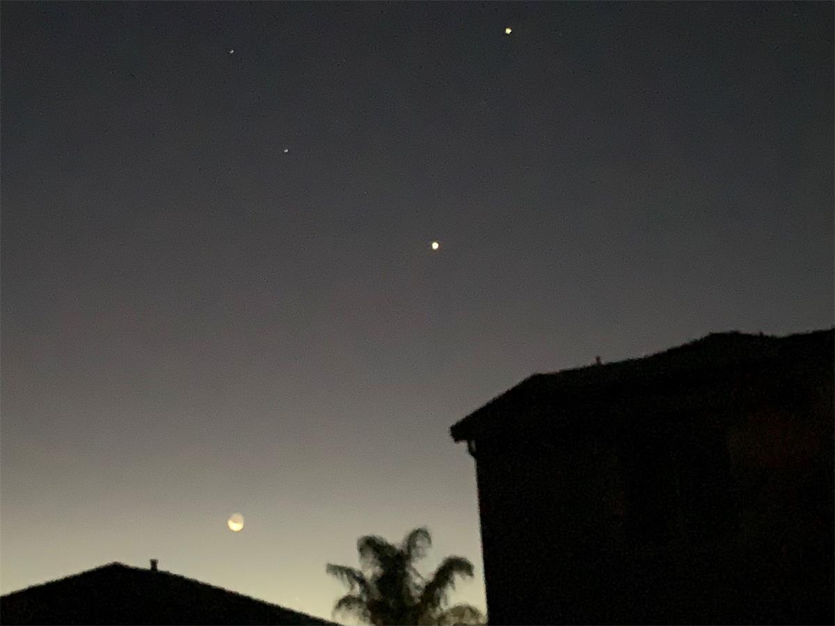.The conjunction is over, we’ve moved from the 12th of August to the 18th. The first image is when the moon comes into the vicinity of the planets Jupiter and Venus. The next image is when the moon joined the planet parade on the 19th. That is followed by an image where the moon is now trailing the two planets. What is not seen there is the planet Mercury which is to the lower right of the Moon. This image was captured on the 21st. The last image was an enlargement of the 21st image and shows Mercury to the lower right of the Moon! Enjoy!.