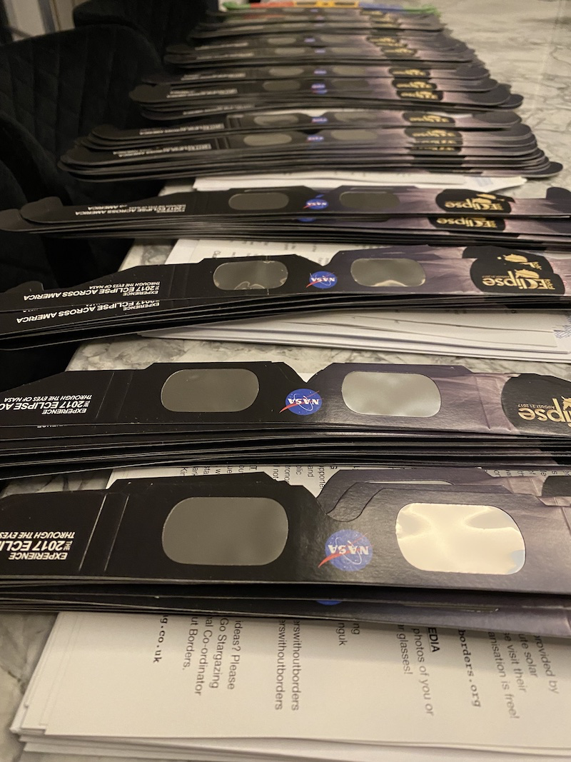 Through Astronomers Without Borders and their Solar Glasses Distribution scheme (https://www.astronomerswithoutborders.org/programs/solar-glasses-distribution), I arranged for 3,200 pairs of solar glasses to be shipped from the USA to the UK for me to redistribute.