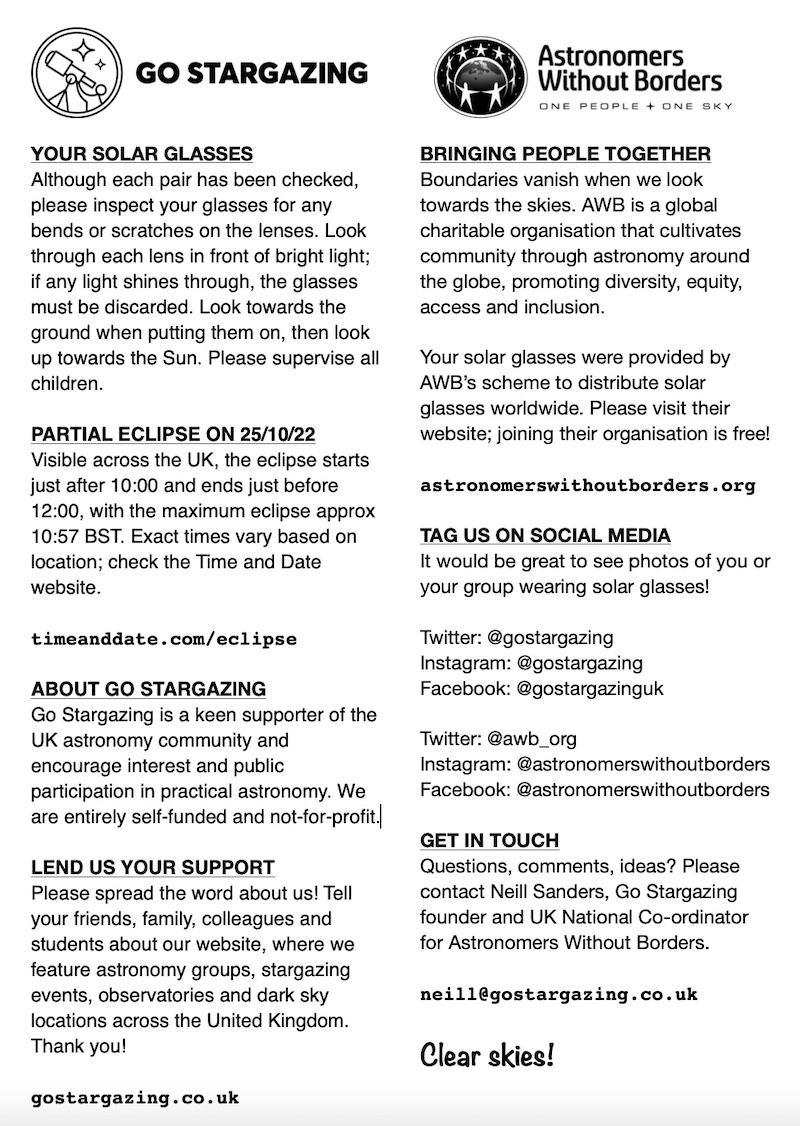 I sent 500 envelopes containing five pairs of glasses, a flyer with guidance, and details about AWB and my Go Stargazing website. I sent a further 600 glasses to schools, astronomy societies and community groups, keeping the remaining 100 to give out at my eclipse observing event (detailed below). After the eclipse, I was thrilled to receive numerous messages from recipients of the solar glasses saying they had seen the eclipse!