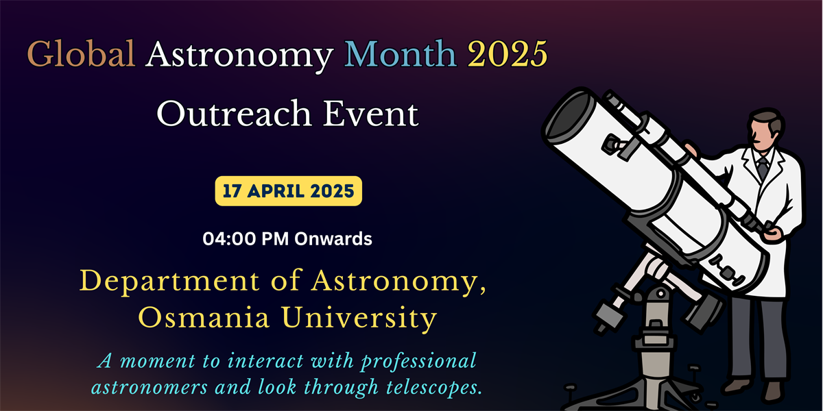 The Department of Astronomy, Osmania University and ASTRO are organising an Outreach event as part of the *Global Astronomy Month 2025* on *17 April 2025* 04 pm onwards at Department of Astronomy premises. We invite a few registrations from astro enthusiasts to attend the event.