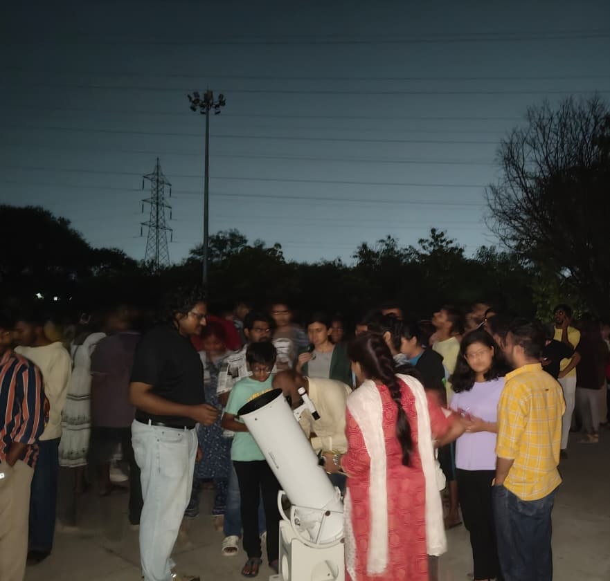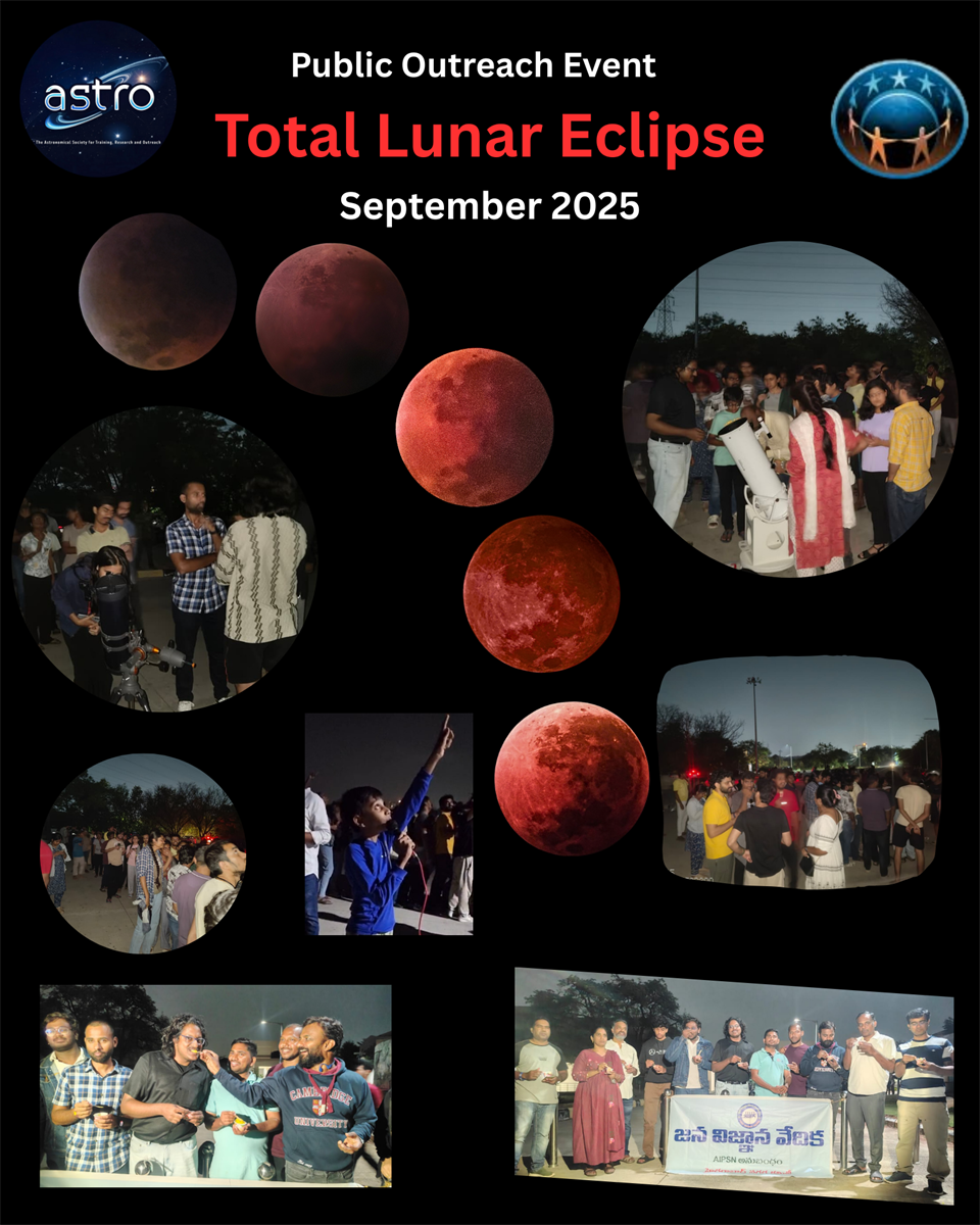 The Astronomical Society for Training, Research, and Outreach (ASTRO), in collaboration with Astronomers Without Borders, successfully organised a public outreach program during the Total Lunar Eclipse on September 7, 2025, at the Amphitheatre Area of Hyderabad Central University. The event was held with Jana Vignana Vedika and the Campus Biodiversity Club. It invited students, faculty, and the general public to witness and understand the rare celestial phenomenon of a total lunar eclipse through guided sky-watching sessions and expert talks.